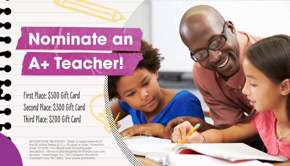 We’re celebrating Erie’s most spirited educators! Nominate your favorite teacher for the chance to help them win a share of $1,000 in Giant Eagle Gift Cards to recognize the passion and energy they bring to their classrooms every day.